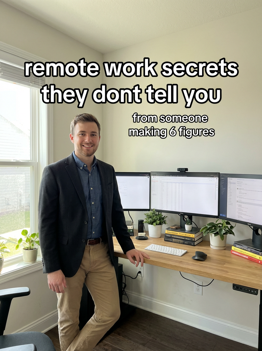 model in professional attire at home office setup, multiple monitors, plants, organized desk, natural lighting. TikTok-style text overlay with white text with black outline: "remote work secrets they dont tell you" smaller text: "(from someone making 6 figures)", do not show tiktok interface or logo