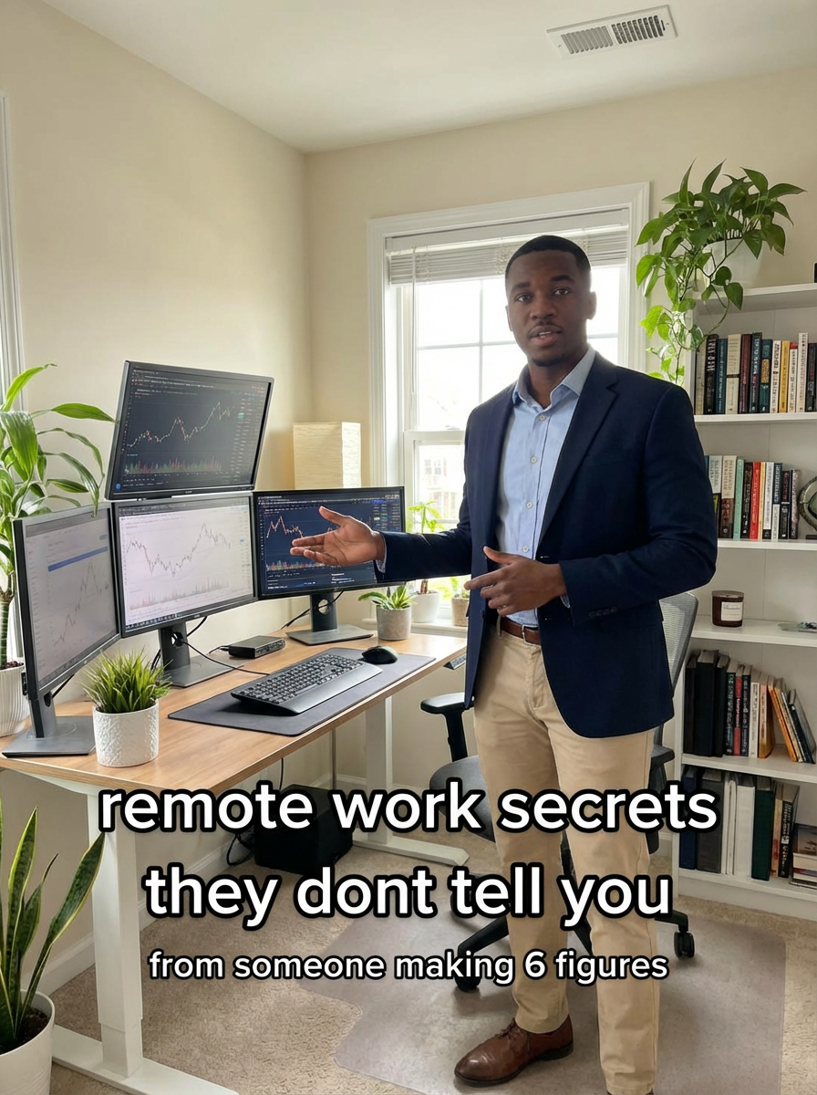 model in professional attire at home office setup, multiple monitors, plants, organized desk, natural lighting. TikTok-style text overlay with white text with black outline: "remote work secrets they dont tell you" smaller text: "(from someone making 6 figures)", do not show tiktok interface or logo