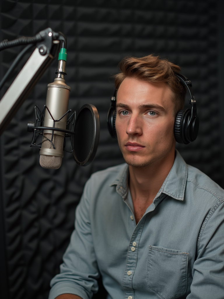 model in professional podcast booth, wearing business casual shirt, isolation booth setup, professional microphone, focused expression, broadcast quality lighting