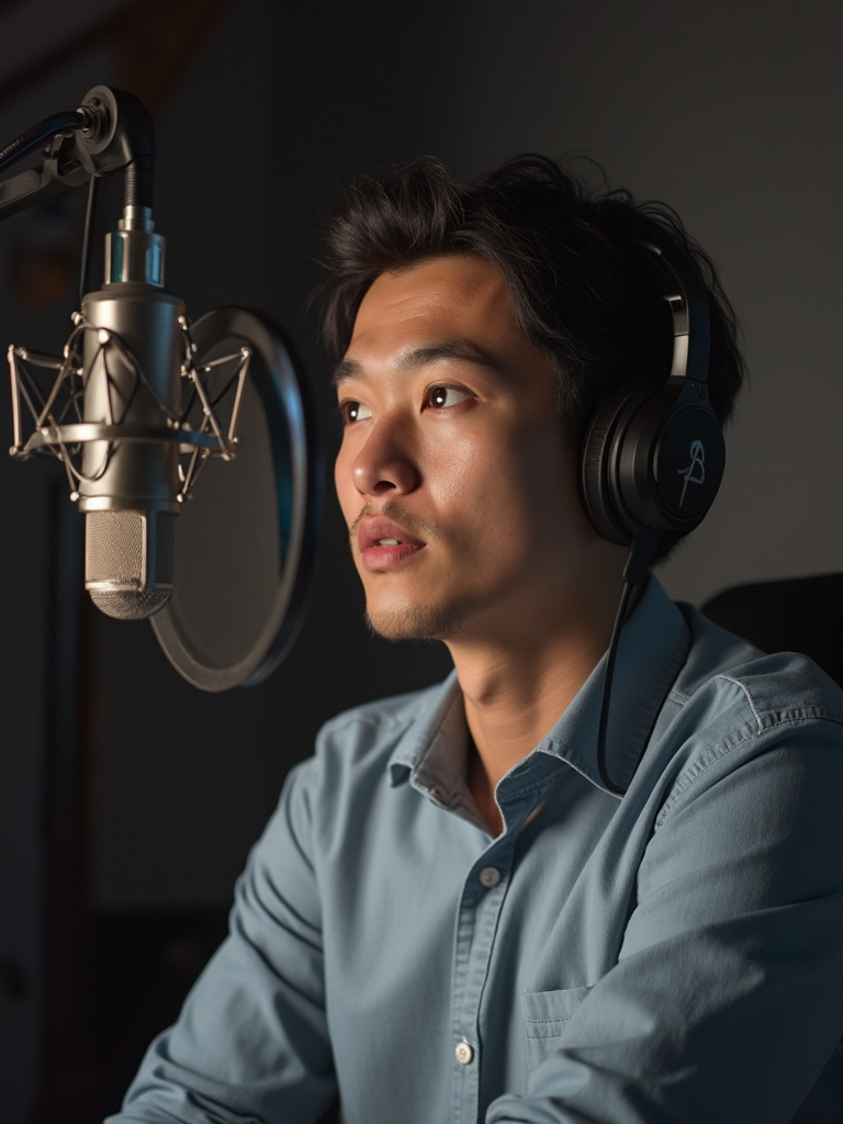 model in professional podcast booth, wearing business casual shirt, isolation booth setup, professional microphone, focused expression, broadcast quality lighting