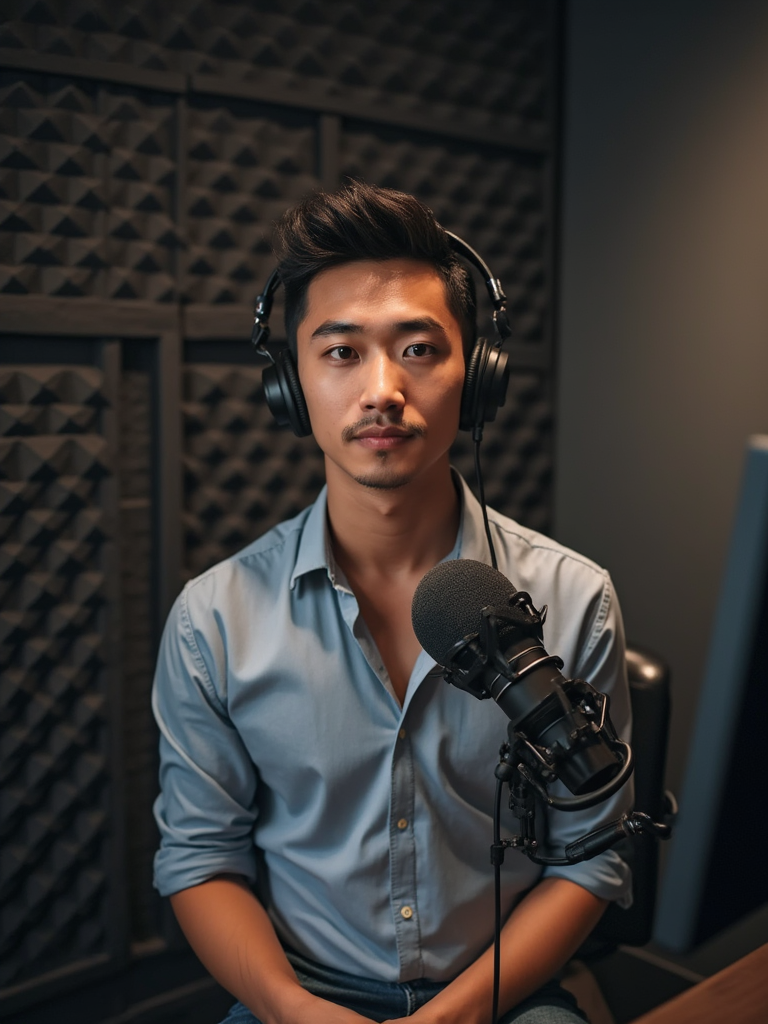 model in professional podcast booth, wearing business casual shirt, isolation booth setup, professional microphone, focused expression, broadcast quality lighting
