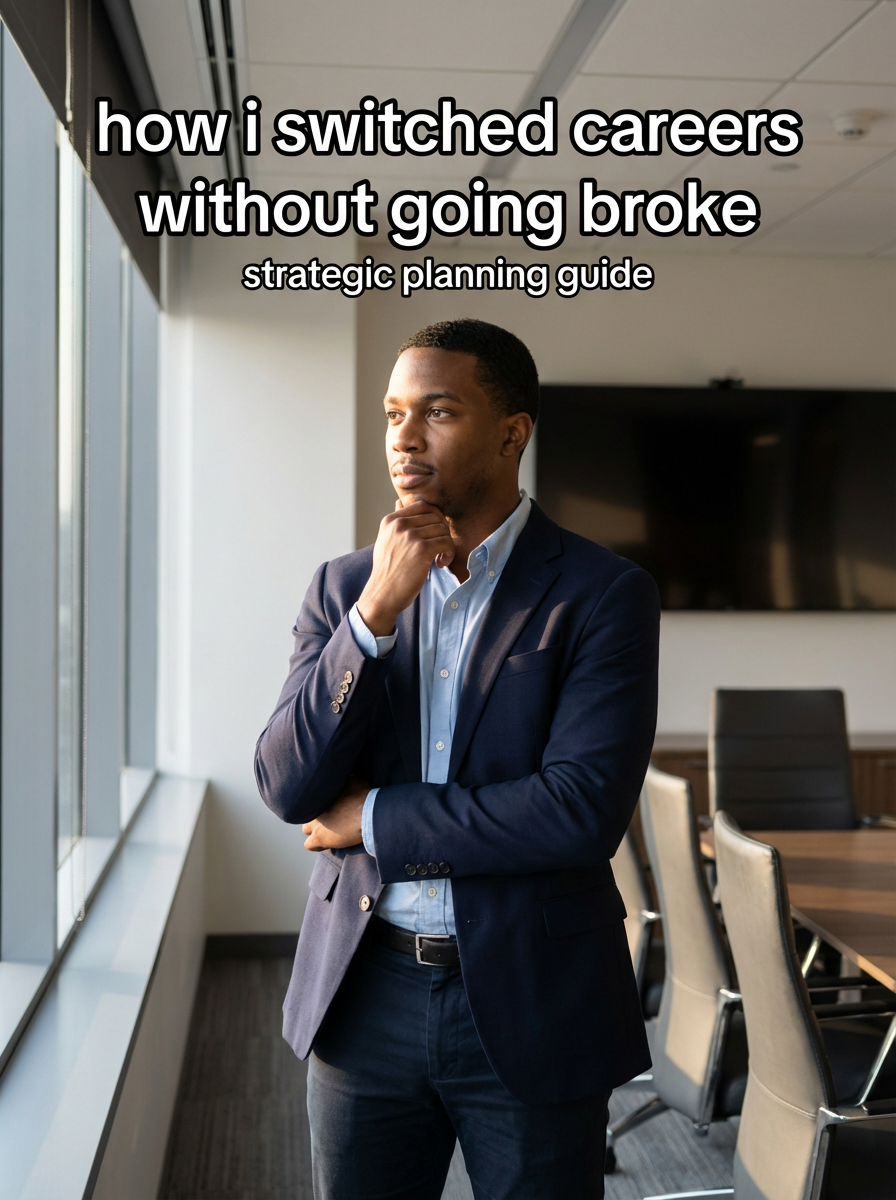 model in professional transition attire in office or meeting room, confident but contemplative, transitional lighting. TikTok text overlay: "how i switched careers without going broke" smaller text: "(strategic planning guide)", do not show tiktok interface