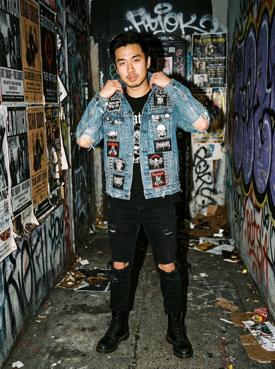 model in punk rock album style, DIY aesthetic, raw energy, rebellious attitude, gritty background