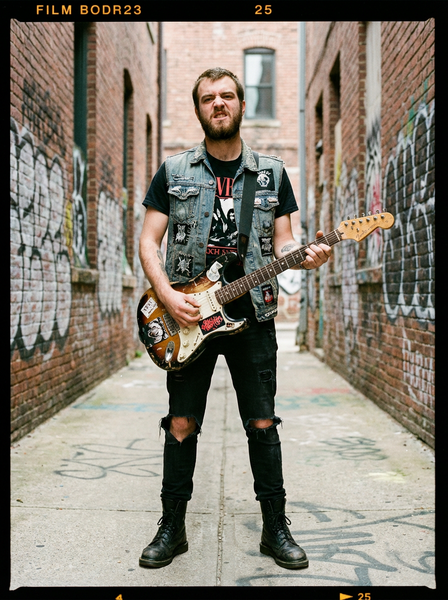 model in punk rock album style, DIY aesthetic, raw energy, rebellious attitude, gritty background