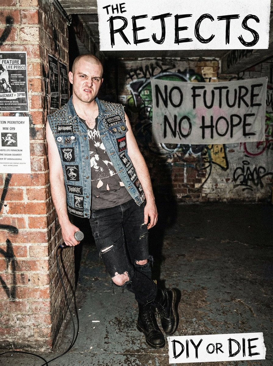 model in punk rock album style, DIY aesthetic, raw energy, rebellious attitude, gritty background