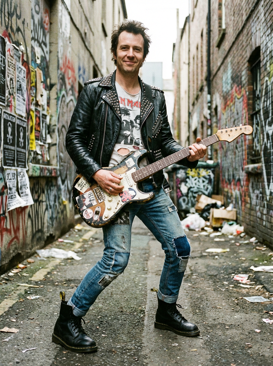 model in punk rock album style, DIY aesthetic, raw energy, rebellious attitude, gritty background