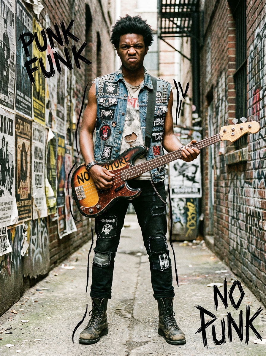 model in punk rock album style, DIY aesthetic, raw energy, rebellious attitude, gritty background