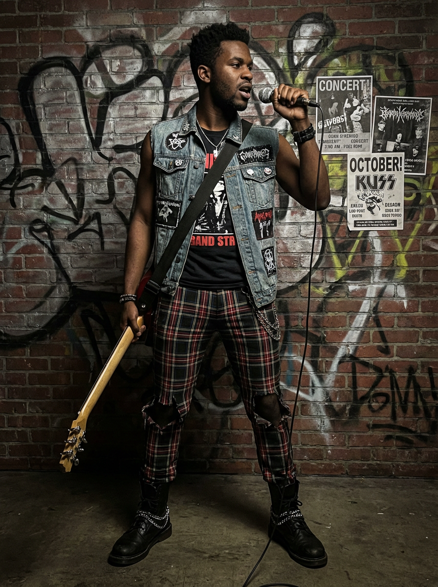model in punk rock album style, DIY aesthetic, raw energy, rebellious attitude, gritty background