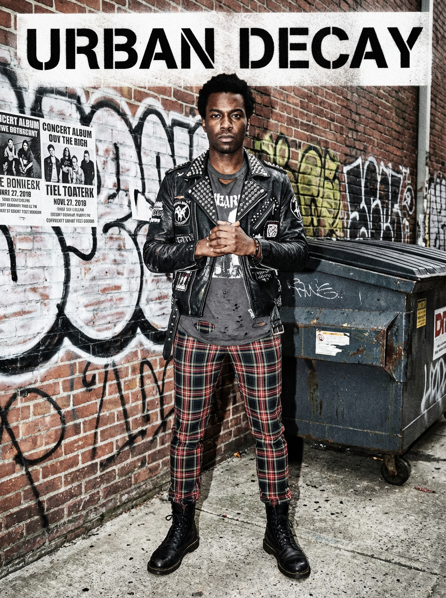 model in punk rock album style, DIY aesthetic, raw energy, rebellious attitude, gritty background