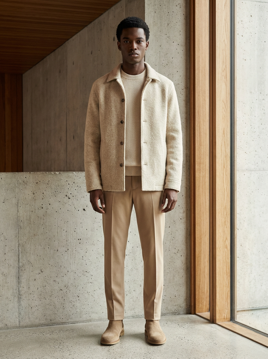 model in quiet luxury layers, cream and tan color palette, quality textures, architectural interior background