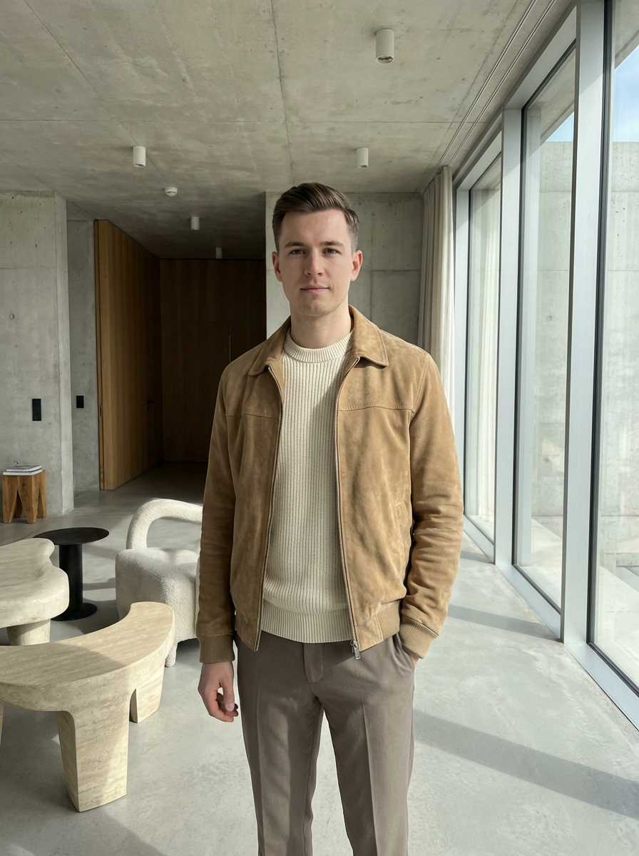model in quiet luxury layers, cream and tan color palette, quality textures, architectural interior background