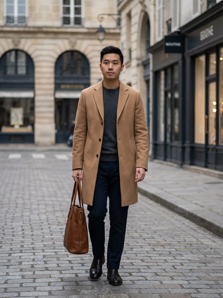 model in quiet luxury outfit, camel coat, quality basics underneath, clean lines, sophisticated urban background