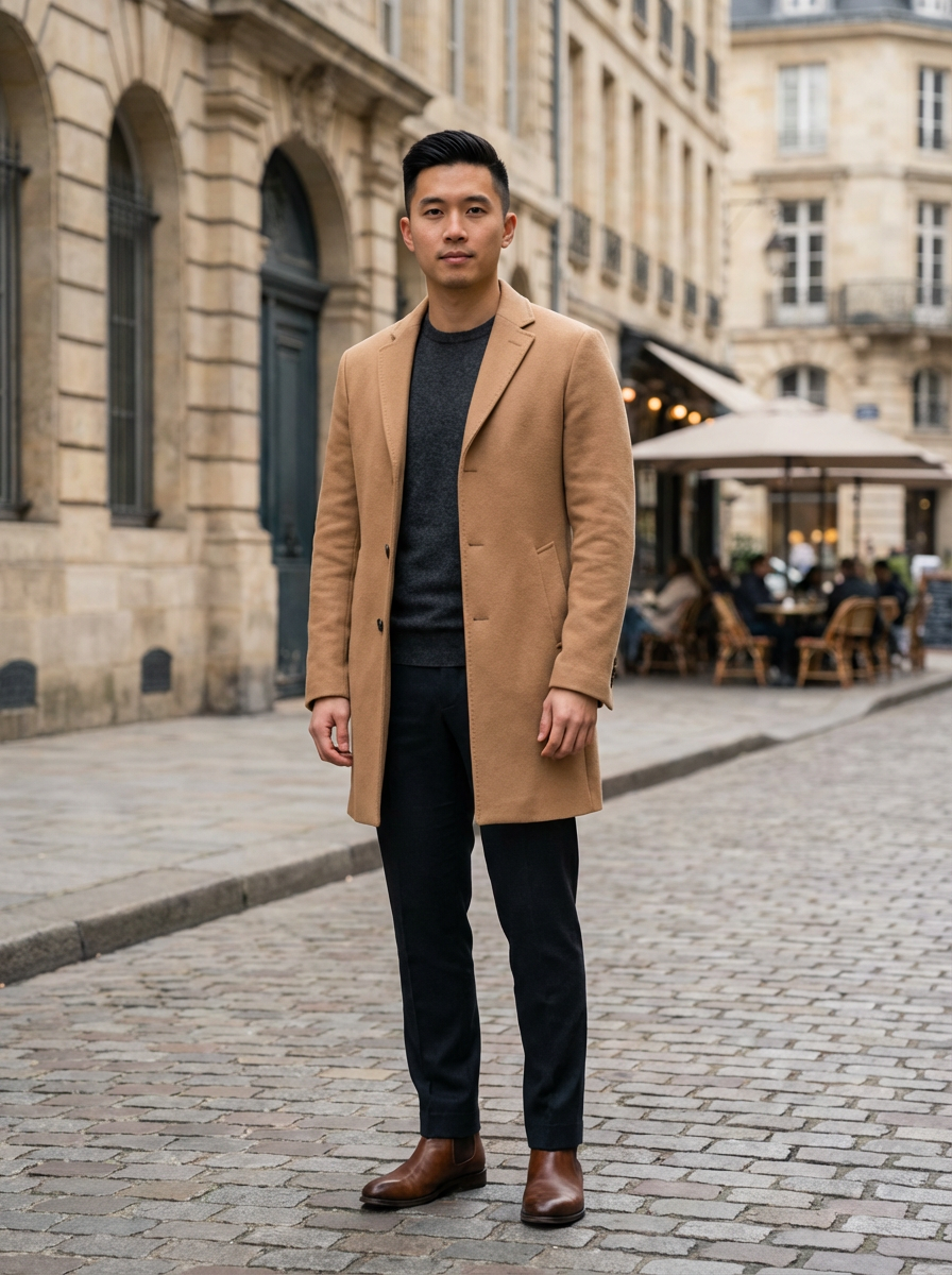 model in quiet luxury outfit, camel coat, quality basics underneath, clean lines, sophisticated urban background