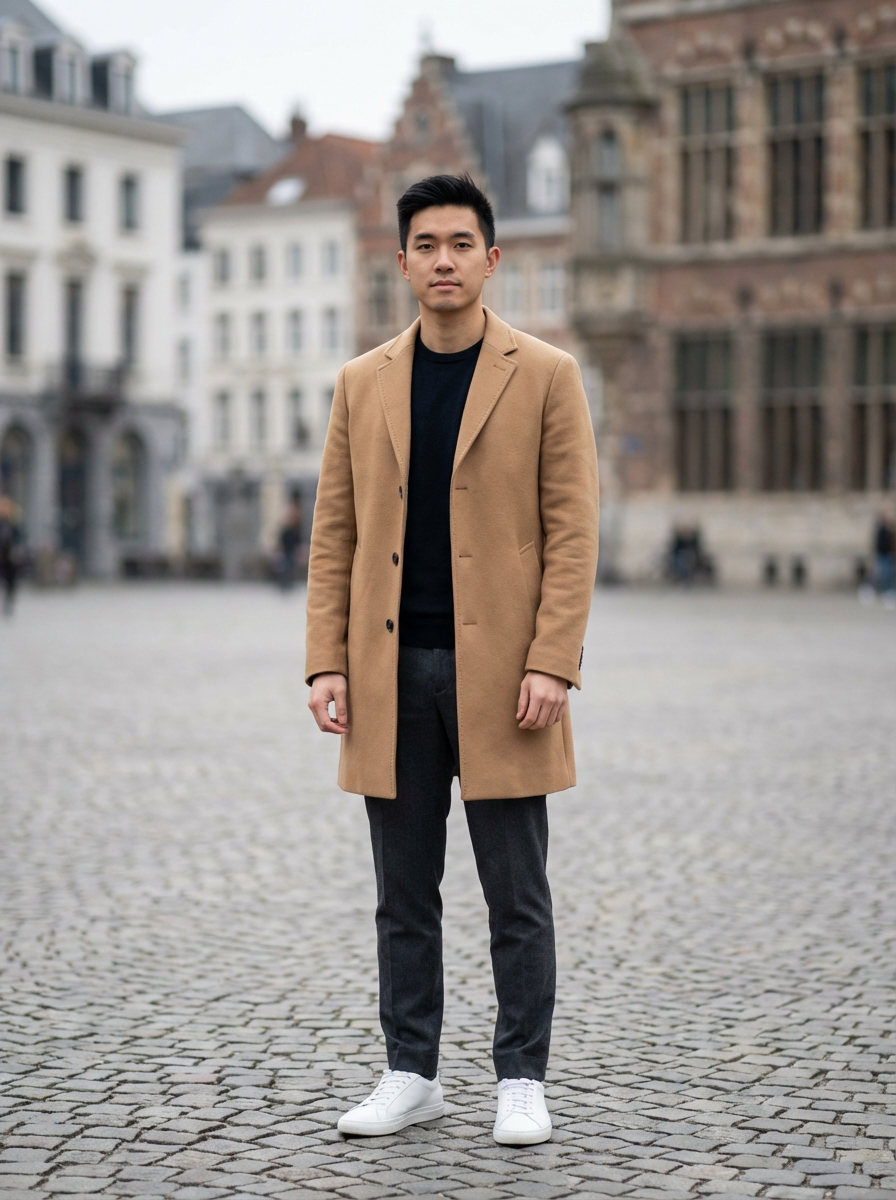 model in quiet luxury outfit, camel coat, quality basics underneath, clean lines, sophisticated urban background