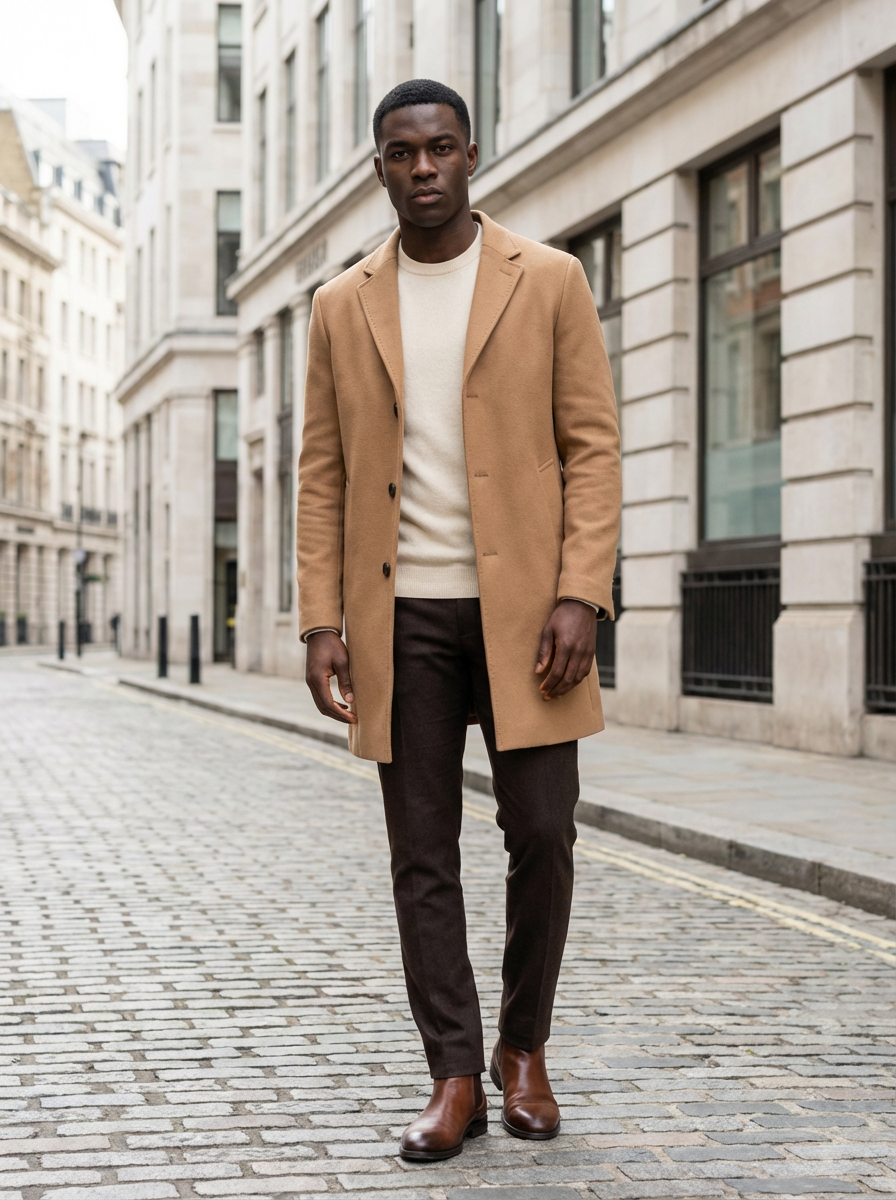 model in quiet luxury outfit, camel coat, quality basics underneath, clean lines, sophisticated urban background