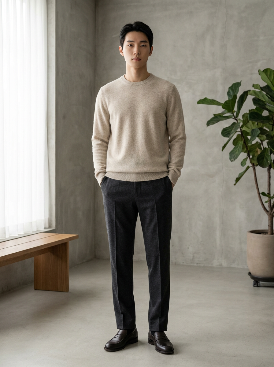 model in quiet luxury style, cashmere sweater in oatmeal, tailored wool trousers, no visible logos, minimalist elegant setting