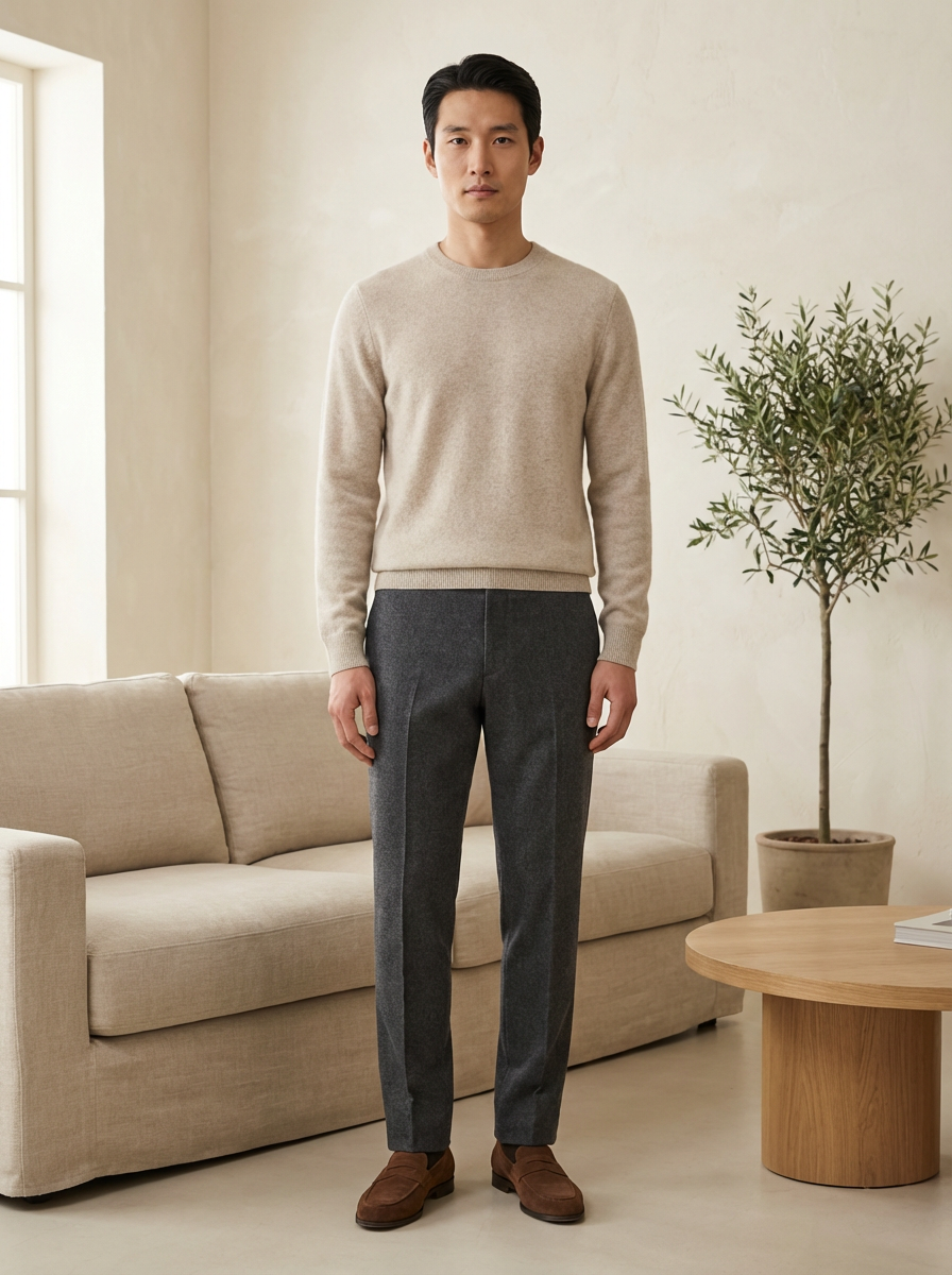 model in quiet luxury style, cashmere sweater in oatmeal, tailored wool trousers, no visible logos, minimalist elegant setting
