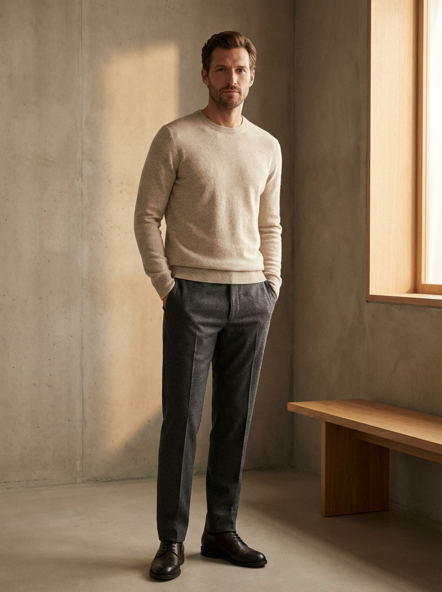 model in quiet luxury style, cashmere sweater in oatmeal, tailored wool trousers, no visible logos, minimalist elegant setting