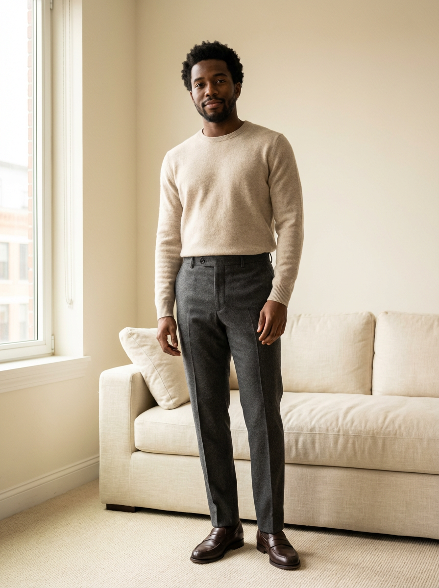 model in quiet luxury style, cashmere sweater in oatmeal, tailored wool trousers, no visible logos, minimalist elegant setting