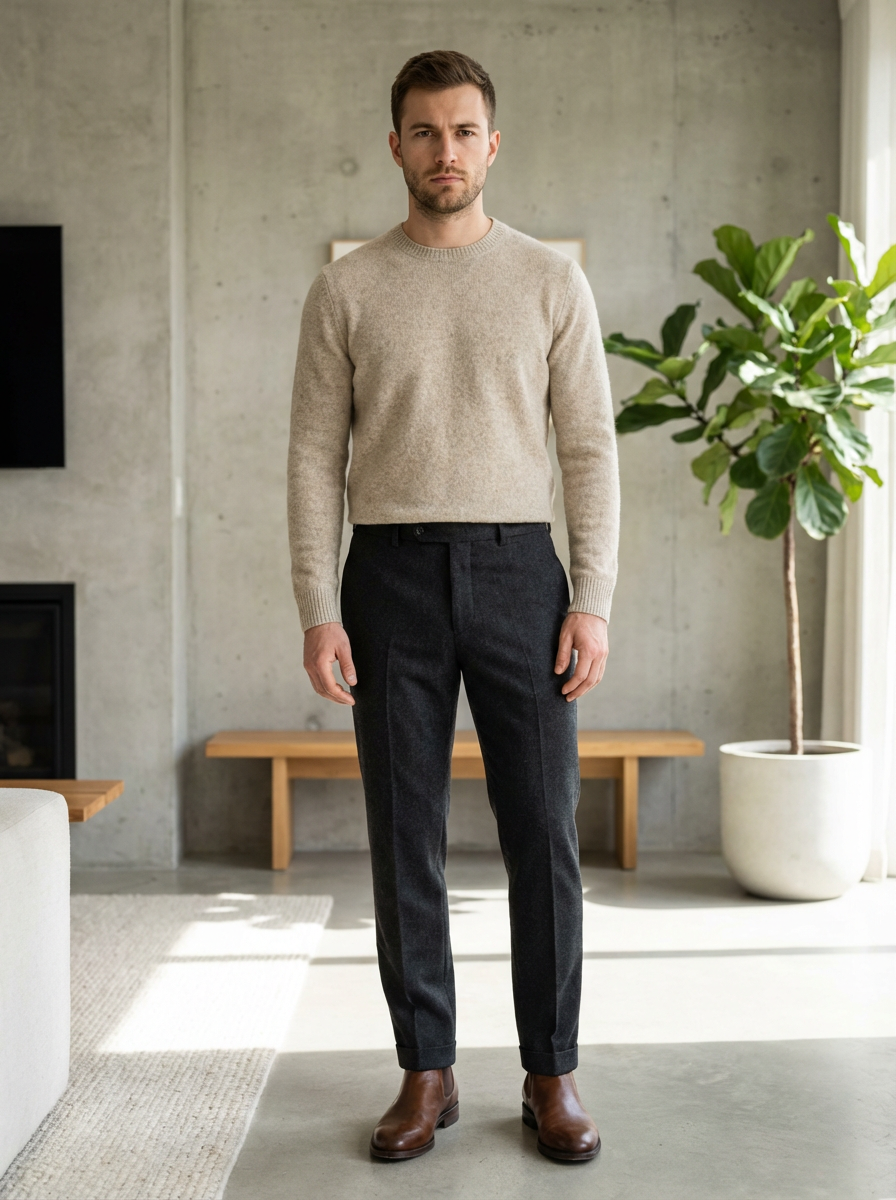 model in quiet luxury style, cashmere sweater in oatmeal, tailored wool trousers, no visible logos, minimalist elegant setting