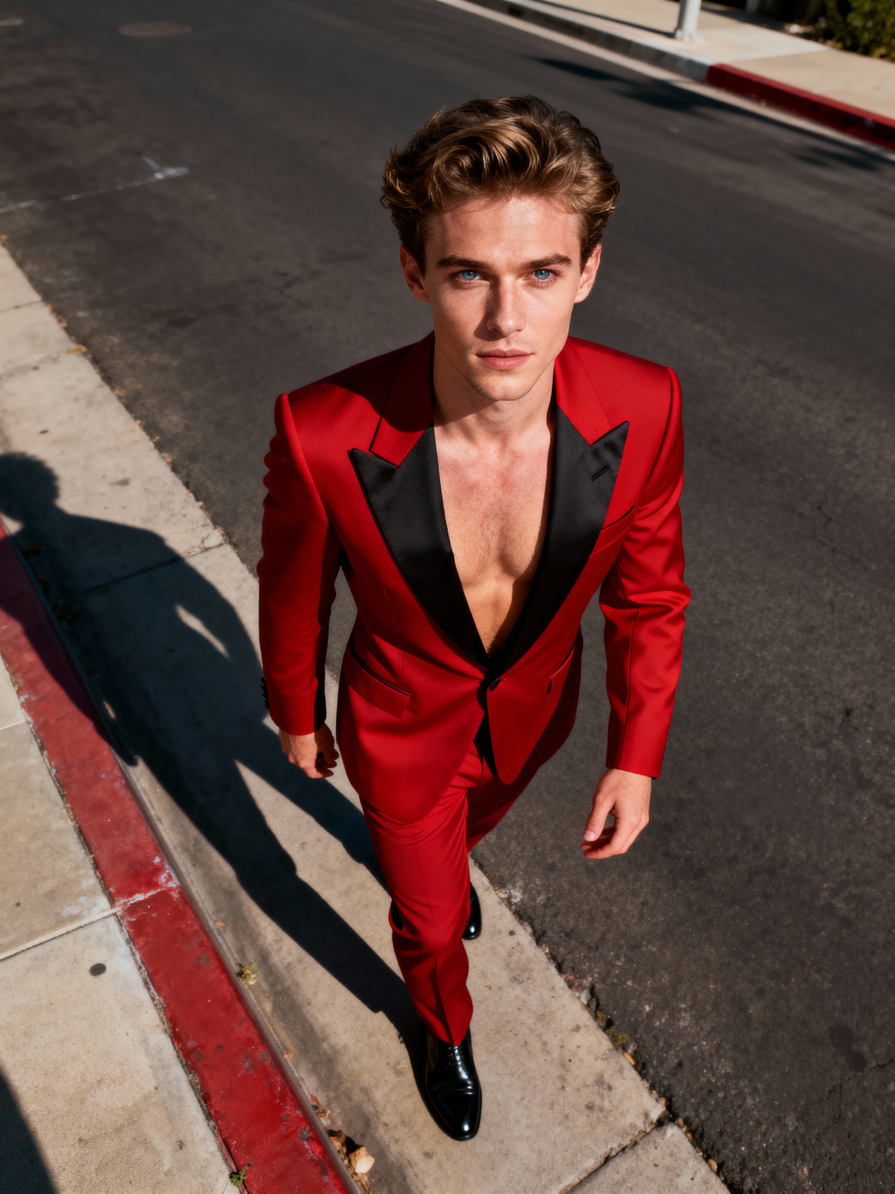 model in red tuxedo showing cleavage walking on the curb in black shoes