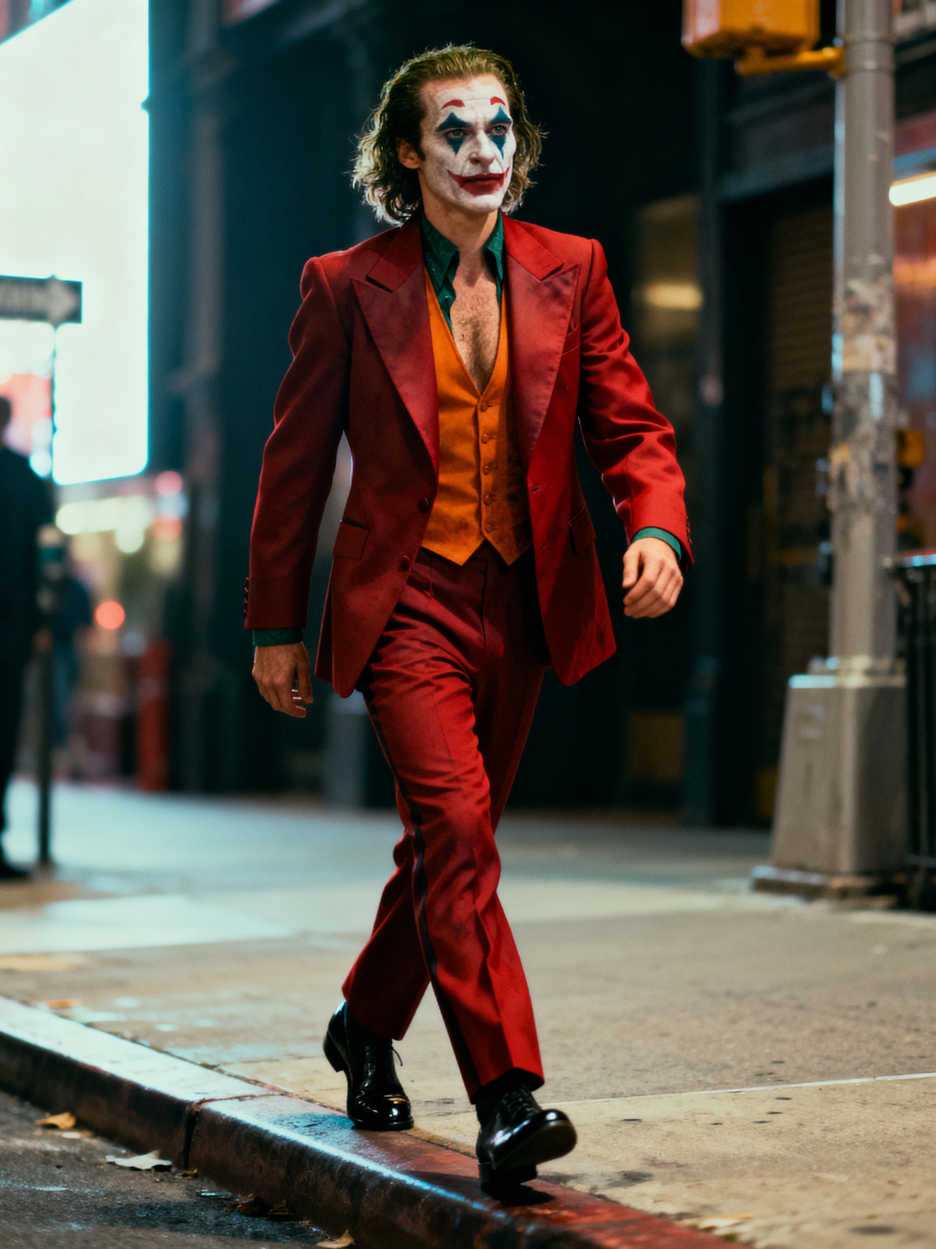 model in red tuxedo showing cleavage walking on the curb in black shoes