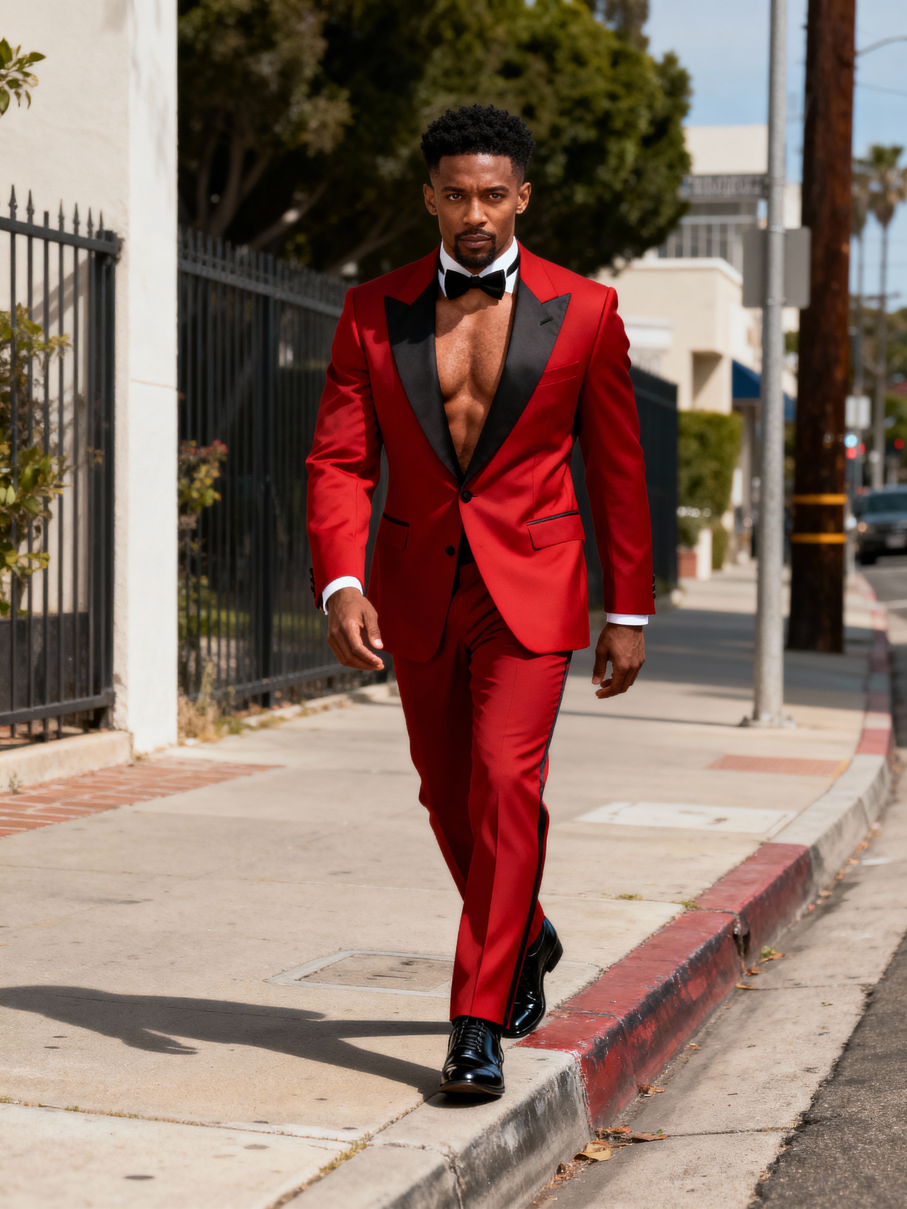 model in red tuxedo showing cleavage walking on the curb in black shoes