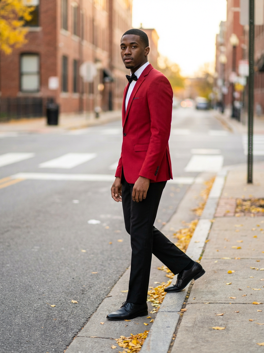 model in red tuxedo showing cleavage walking on the curb in black shoes
