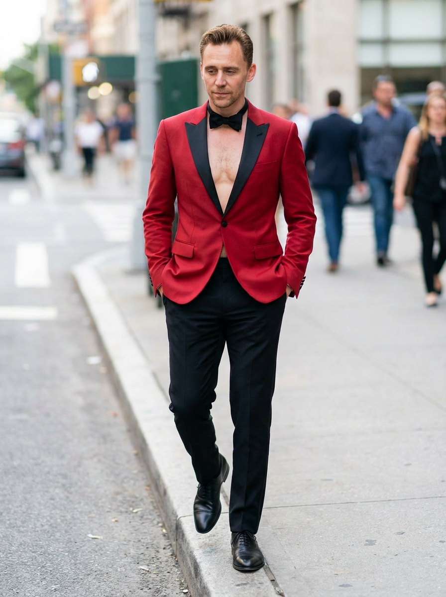 model in red tuxedo showing cleavage walking on the curb in black shoes