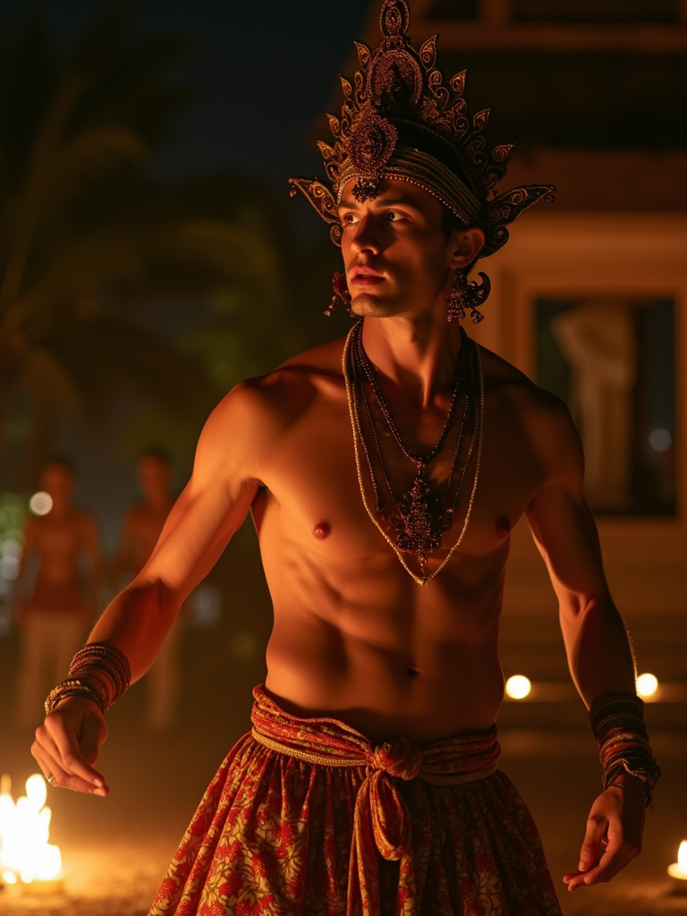 model in resort evening attire at traditional Balinese dance performance, temple backdrop illuminated at night
