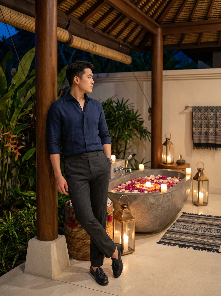 model in resort evening wear at luxury spa villa with flower bath, candles and tropical decor