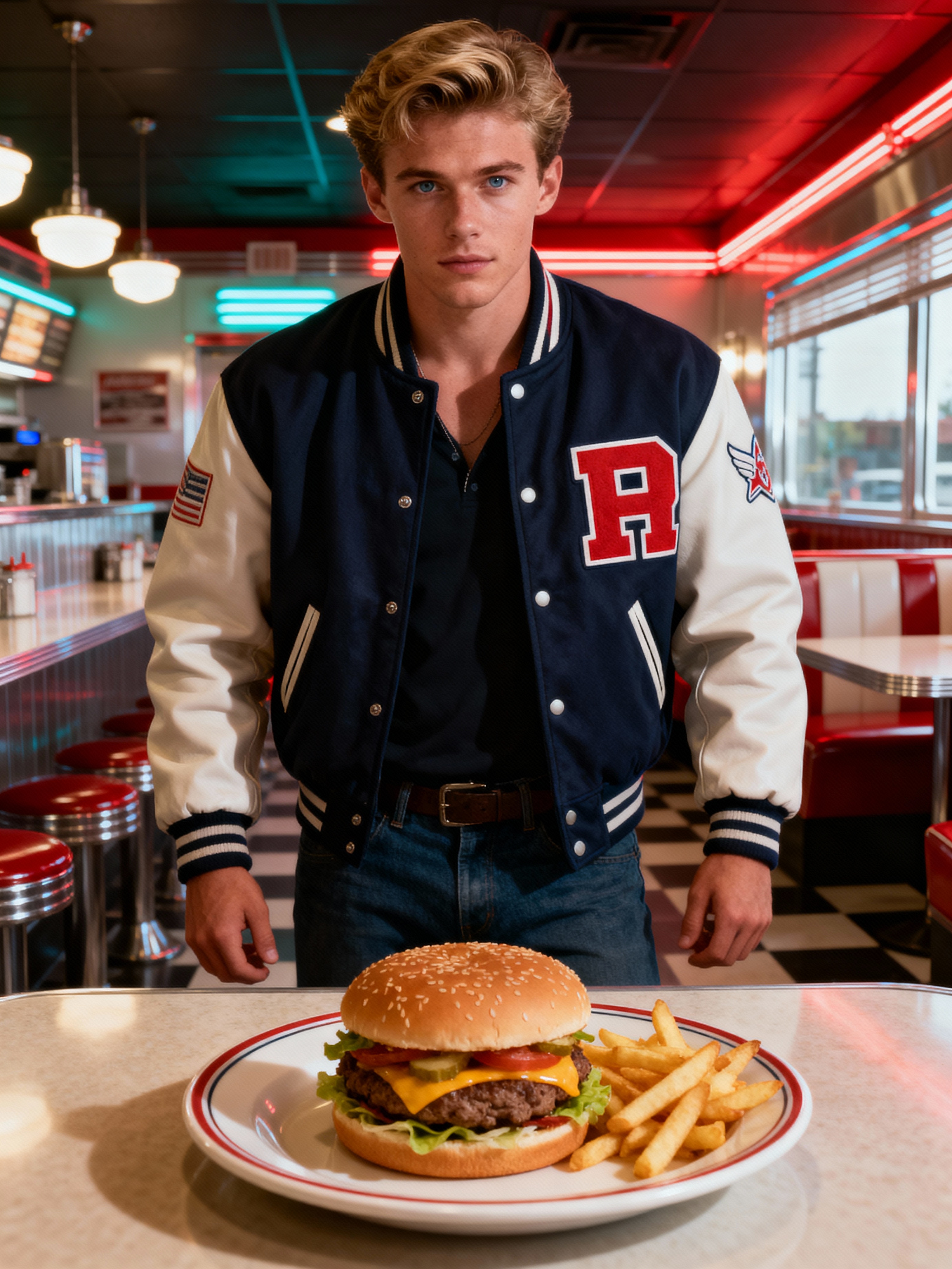 model in retro 1950s diner photo shoot. french fries and one cheeseburger on a plate in front. model wearing varsity bomber