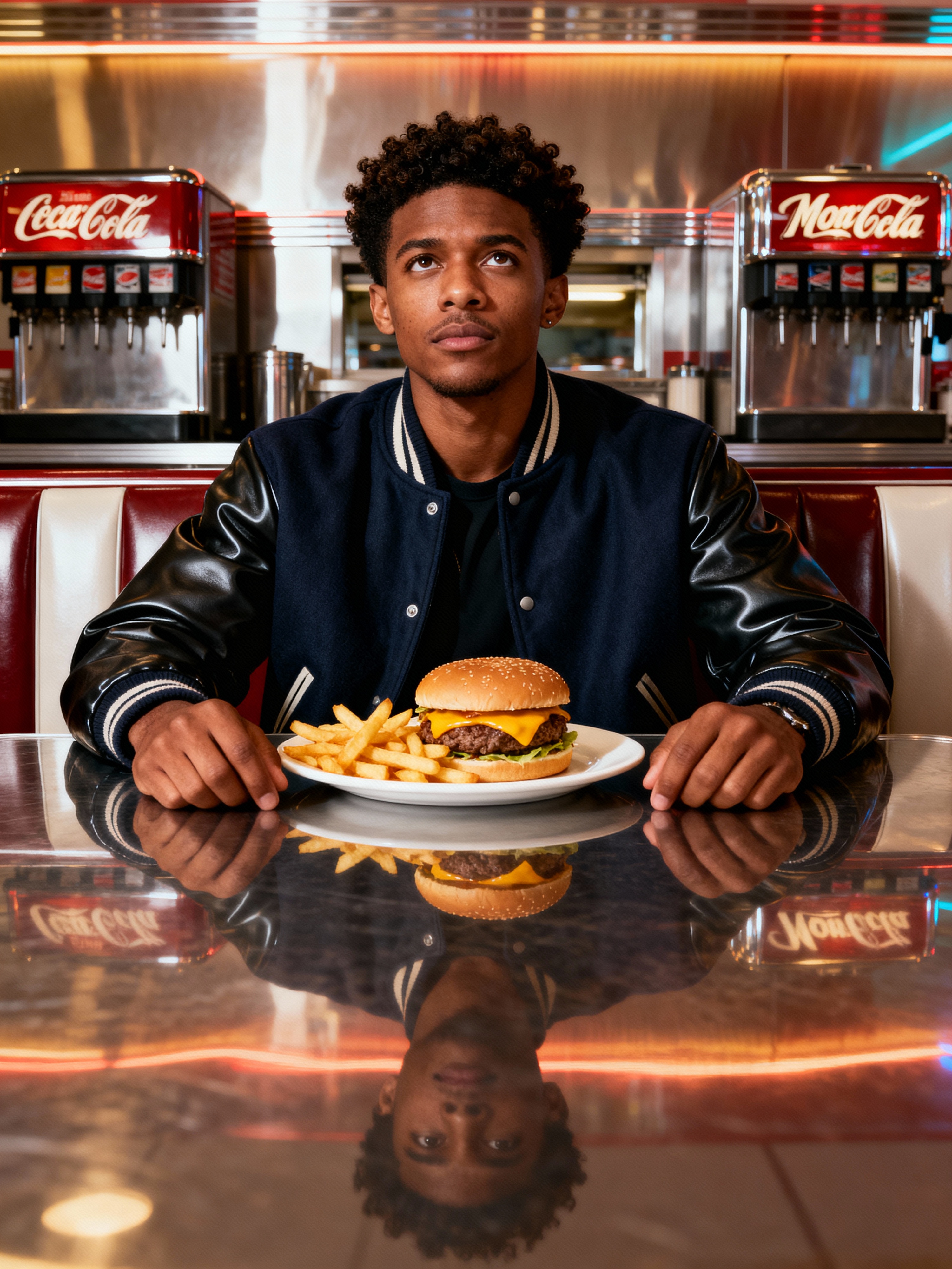 model in retro 1950s diner photo shoot. french fries and one cheeseburger on a plate in front. model wearing varsity bomber