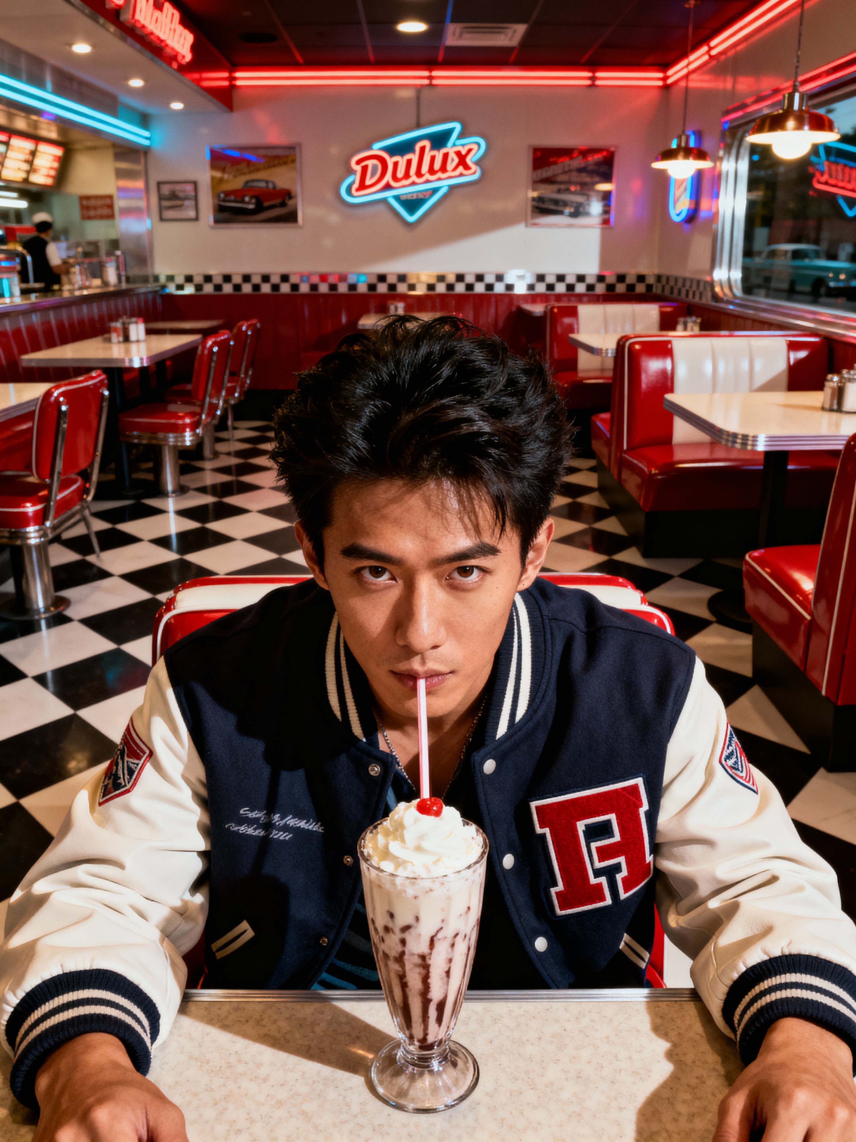 model in retro 1950s diner photo shoot. one milkshake in front. model wearing varsity bomber