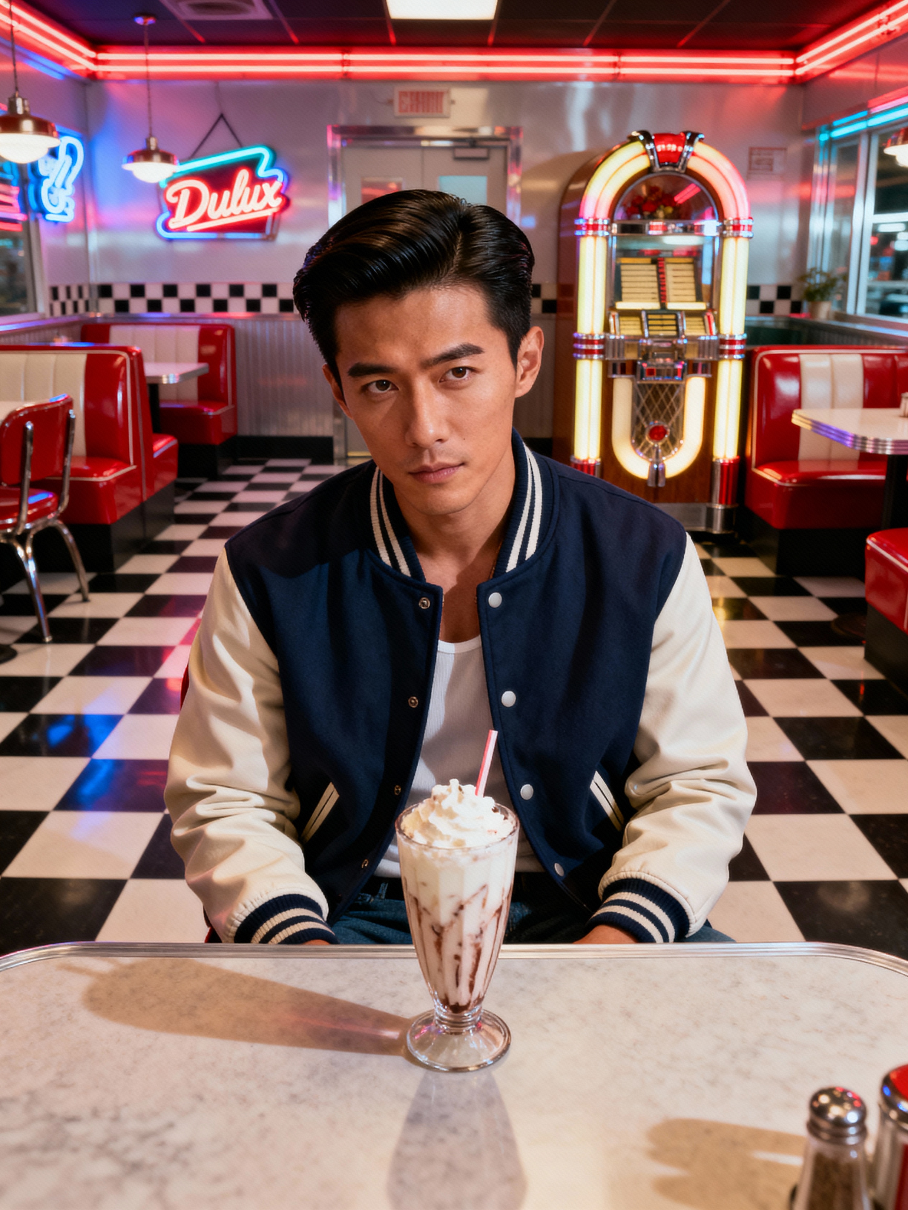 model in retro 1950s diner photo shoot. one milkshake in front. model wearing varsity bomber