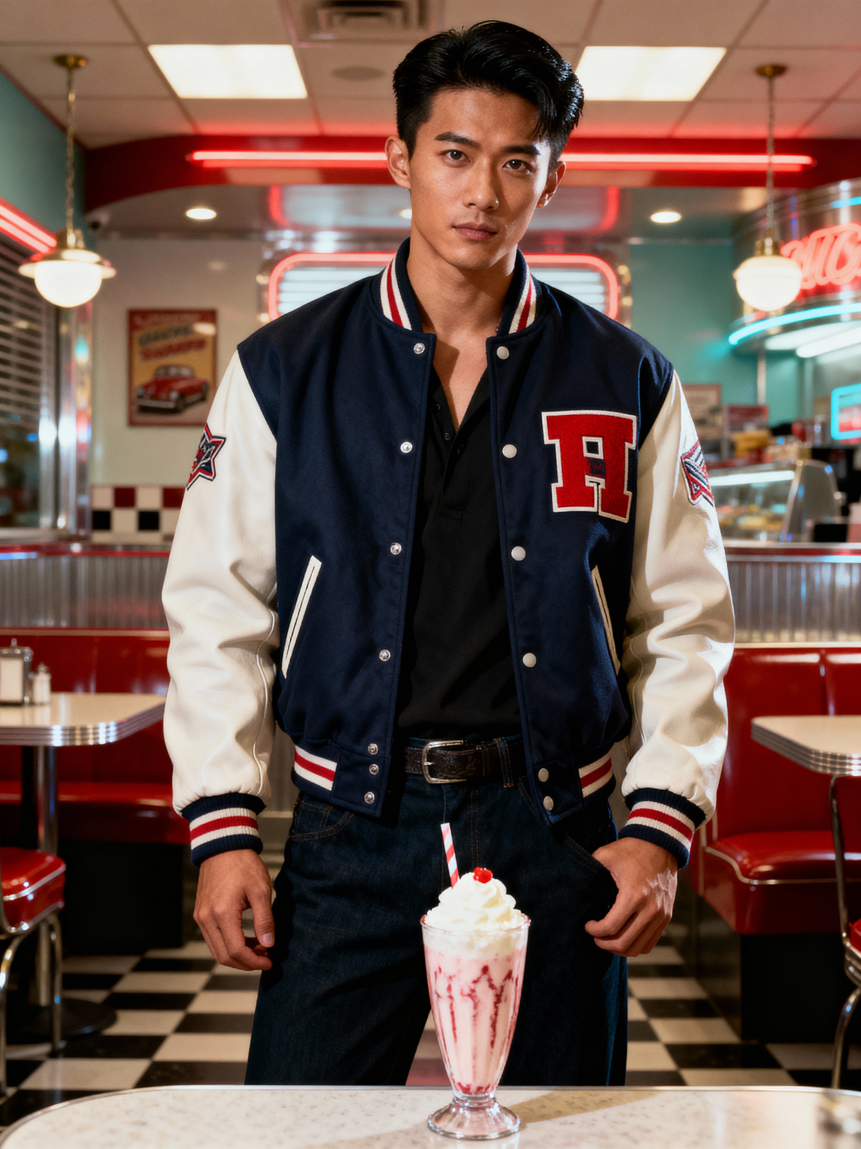 model in retro 1950s diner photo shoot. one milkshake in front. model wearing varsity bomber