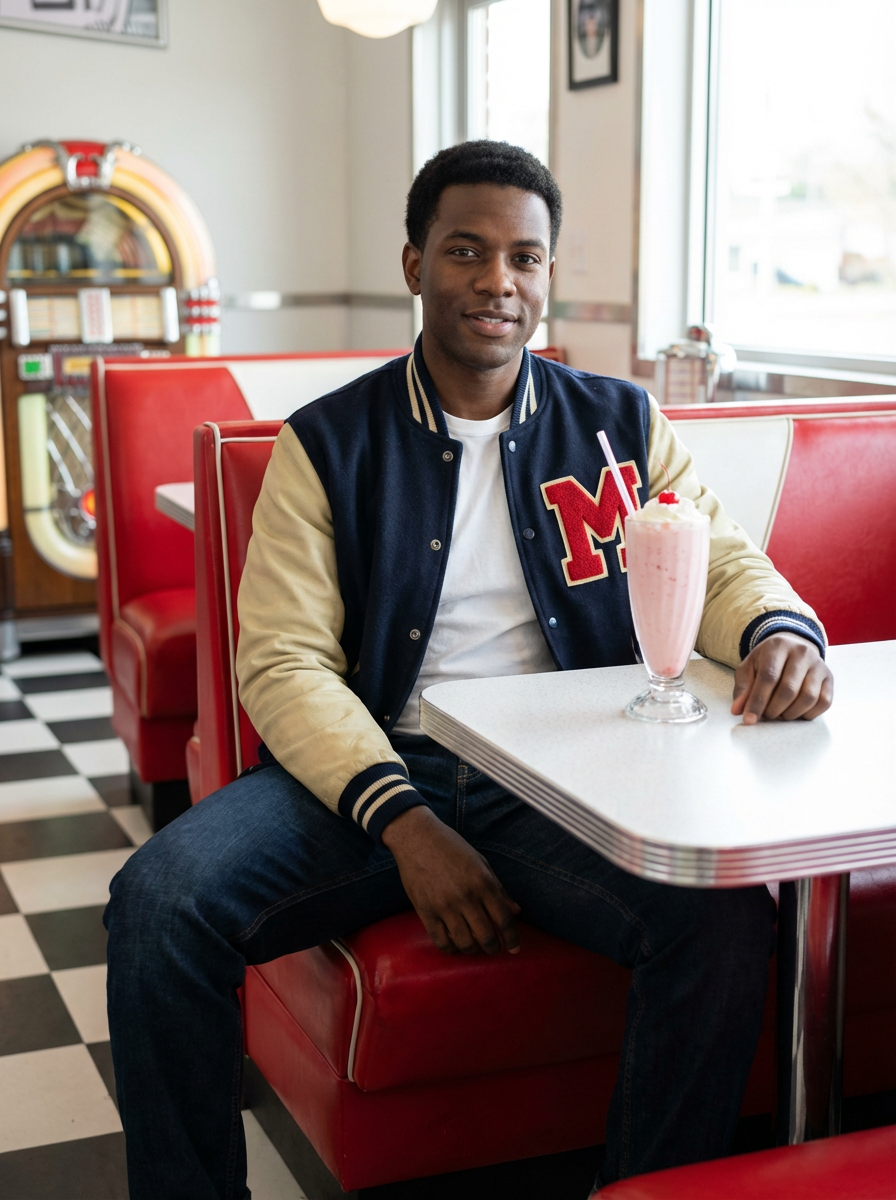 model in retro 1950s diner photo shoot. one milkshake in front. model wearing varsity bomber