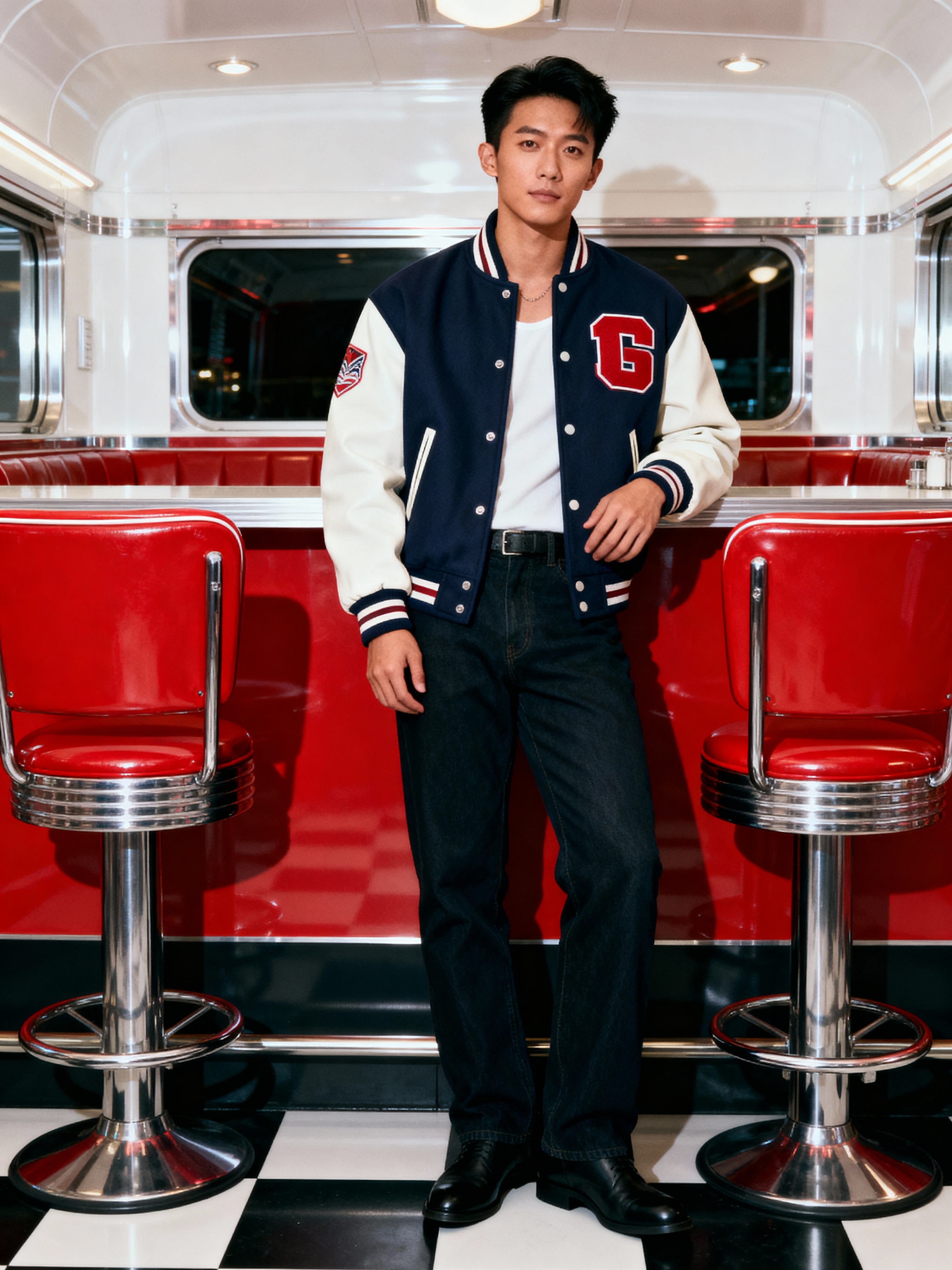 model in retro 1950s diner photo shoot. posing in front of red 1950s barstools. model wearing varsity bomber . white interior with red seats and black and white flooring.