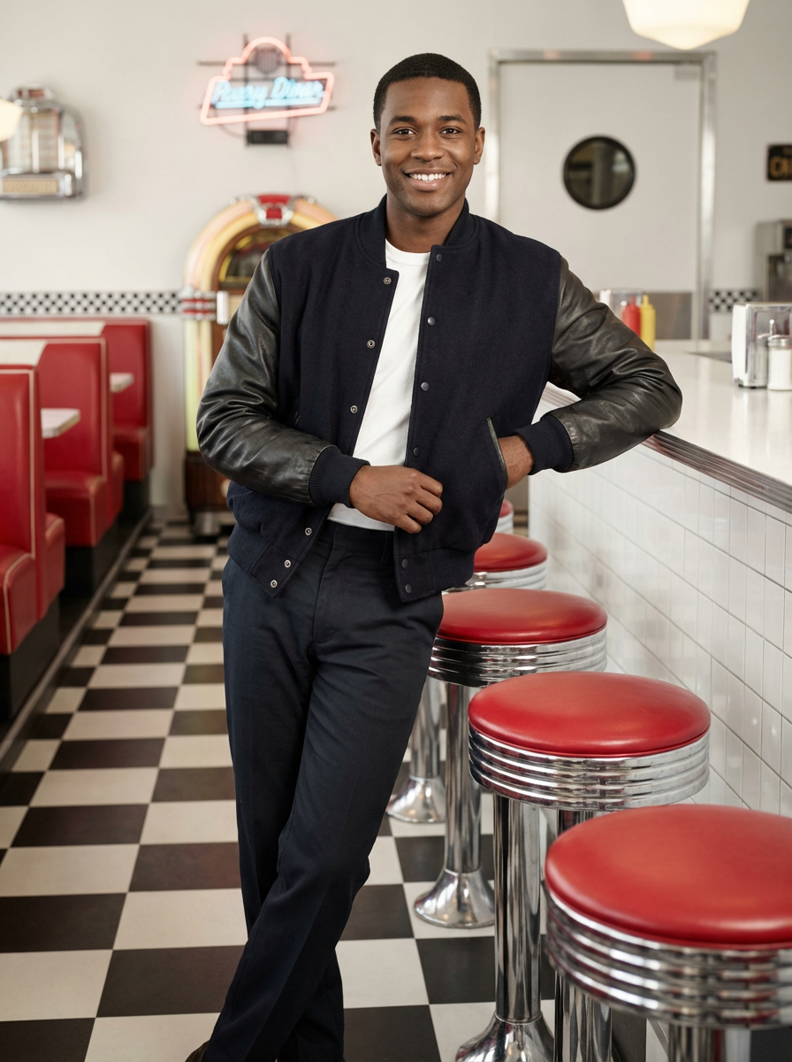 model in retro 1950s diner photo shoot. posing in front of red 1950s barstools. model wearing varsity bomber . white interior with red seats and black and white flooring.