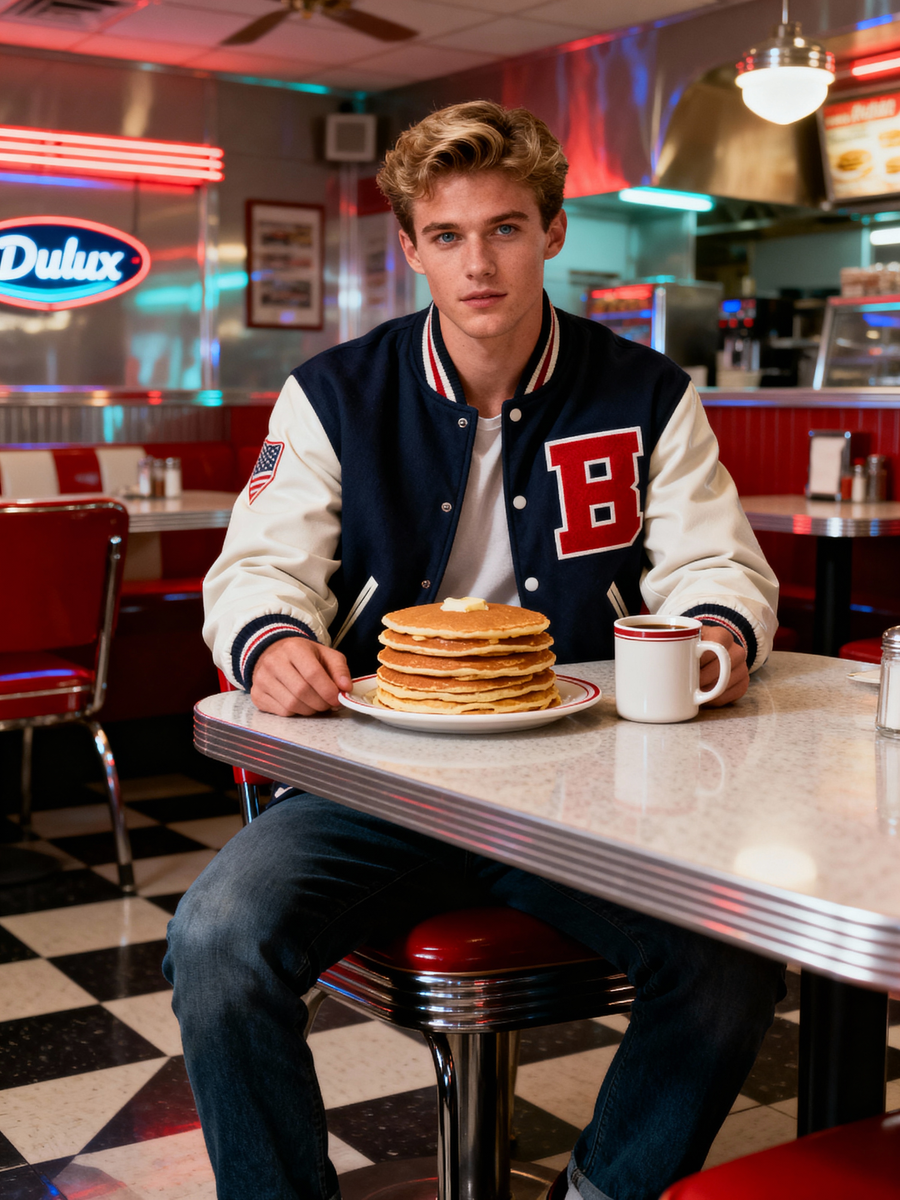 model in retro 1950s diner photo shoot. stack of pancakes and one coffee mug in front. model wearing varsity bomber