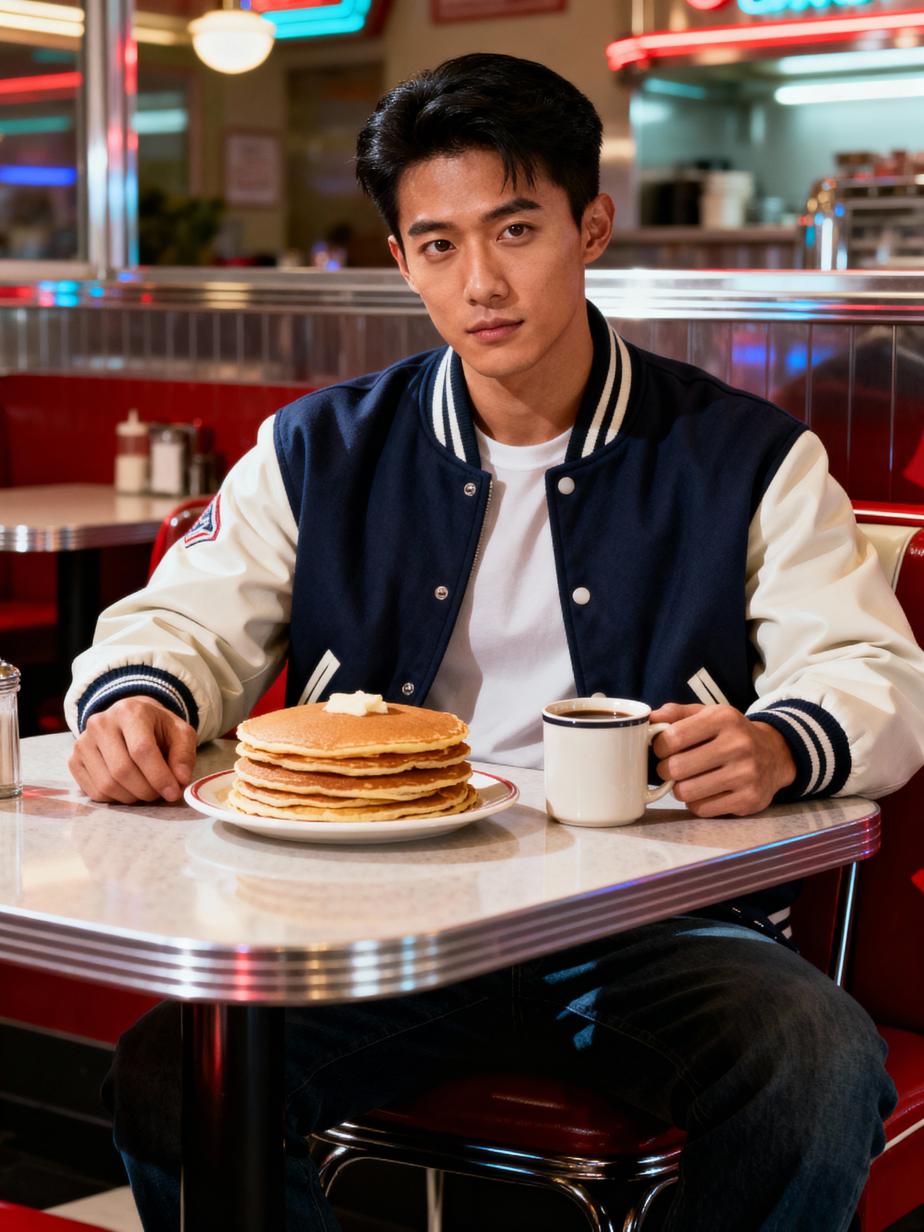 model in retro 1950s diner photo shoot. stack of pancakes and one coffee mug in front. model wearing varsity bomber