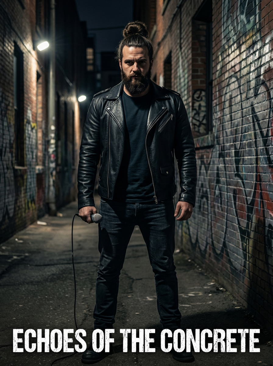 model in rock album cover pose, edgy styling, dramatic lighting, gritty urban or studio setting