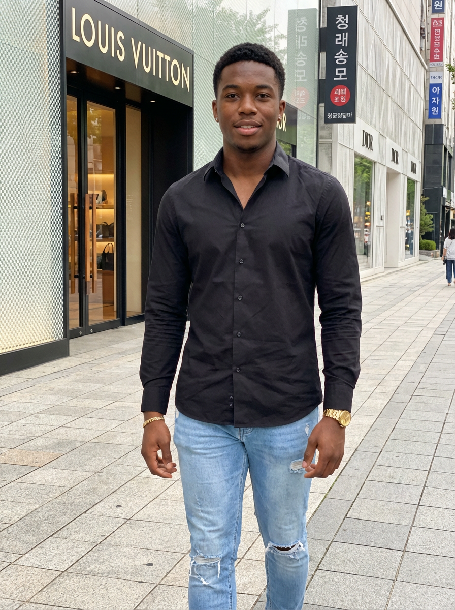 model in Seoul in Gangnam in Cheongdamdong Luxury Shopping street. stores visible in background
