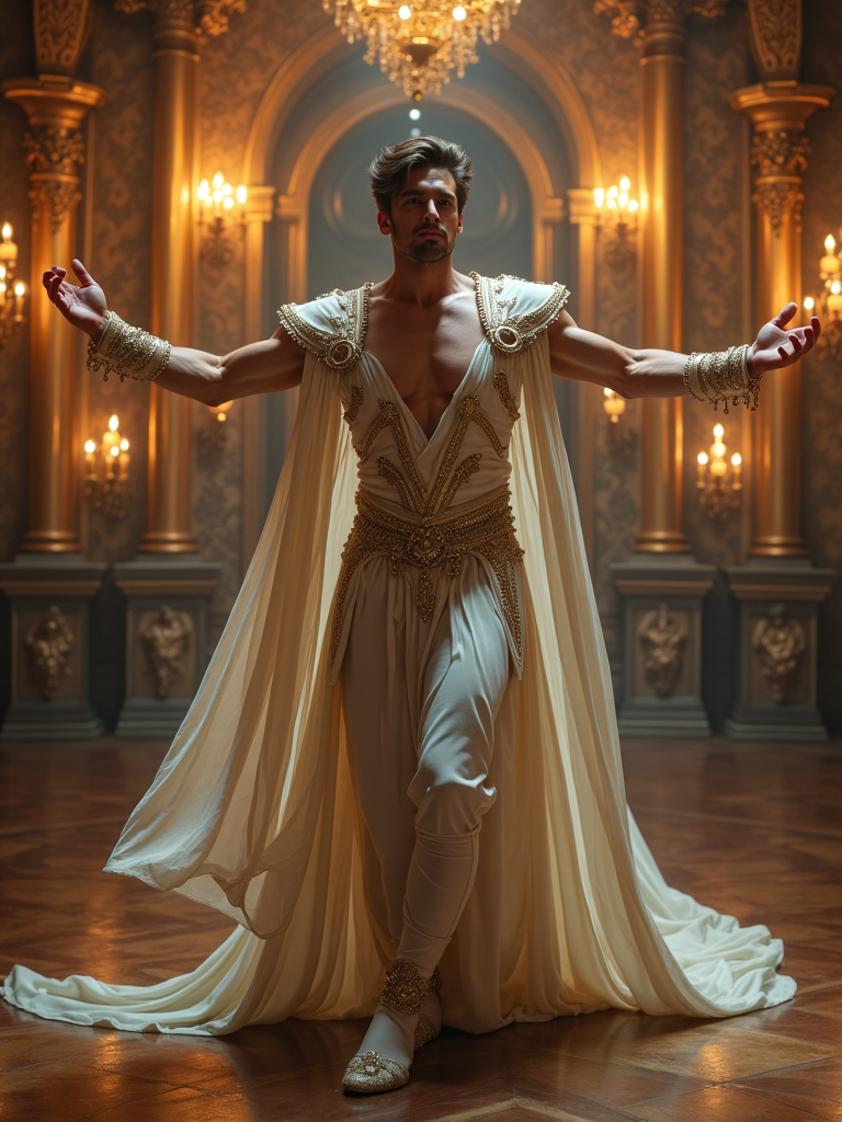 model in shape-shifting royal fantasy outfit dancing in a magical ballroom with floating candles and mirror walls that show different fairy realms
