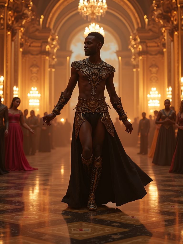 model in shape-shifting royal fantasy outfit dancing in a magical ballroom with floating candles and mirror walls that show different fairy realms