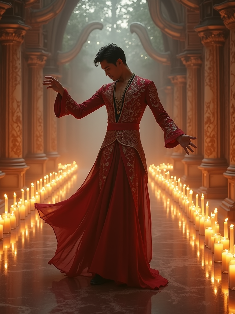 model in shape-shifting royal fantasy outfit dancing in a magical ballroom with floating candles and mirror walls that show different realms