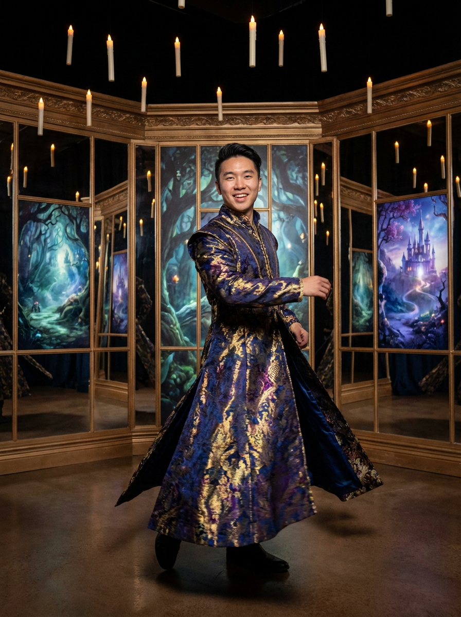 model in shape-shifting royal fantasy outfit dancing in a magical ballroom with floating candles and mirror walls that show different fairy realms