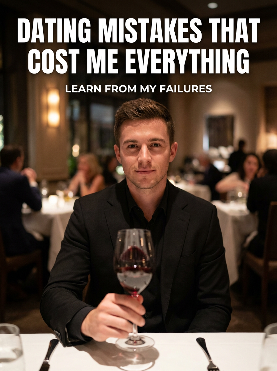 model in sharp black suit at upscale restaurant, dim ambient lighting, wine glass in hand, confident expression. TikTok text overlay: "dating mistakes that cost me everything" smaller text: "(learn from my failures)", do not show tiktok interface