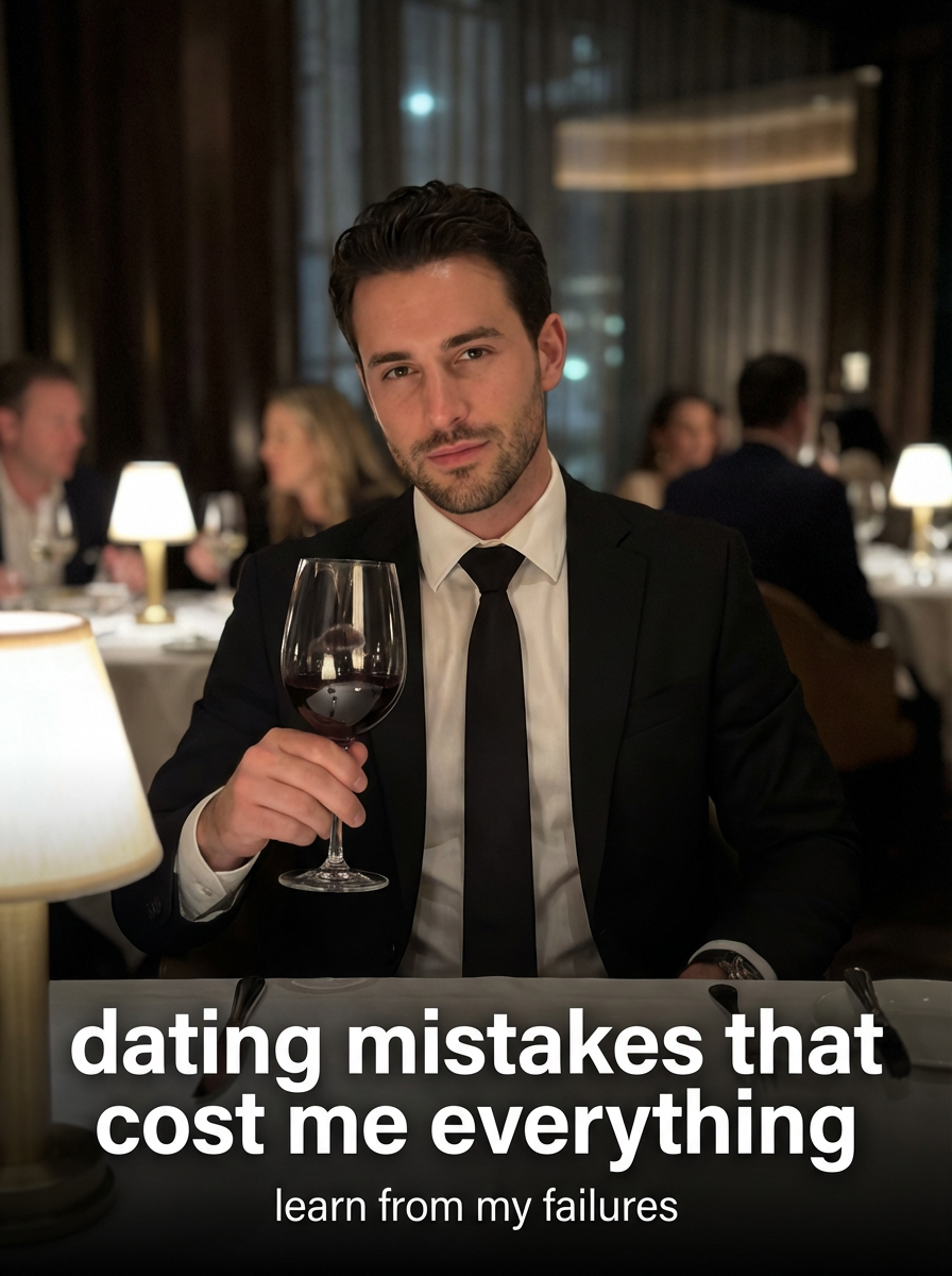 model in sharp black suit at upscale restaurant, dim ambient lighting, wine glass in hand, confident expression. TikTok text overlay: "dating mistakes that cost me everything" smaller text: "(learn from my failures)", do not show tiktok interface