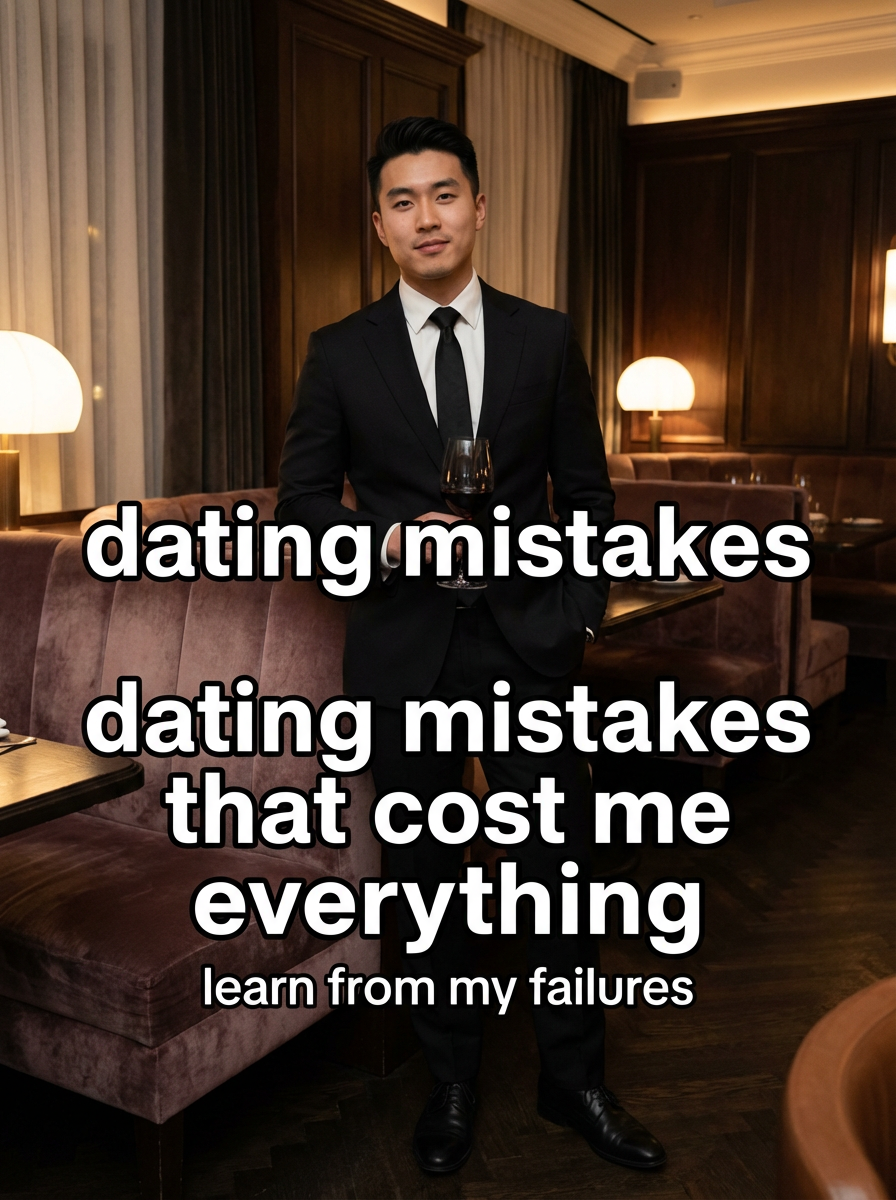 model in sharp black suit at upscale restaurant, dim ambient lighting, wine glass in hand, confident expression. TikTok TikTok-style text overlay with white text with black outline: "dating mistakes that cost me everything" smaller text: "(learn from my failures)", do not show tiktok interface or logo